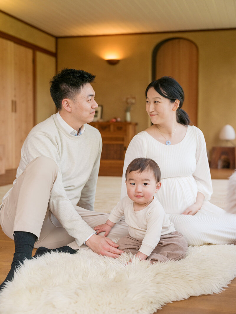 Anji and Sherwin's winter studio session in Berkeley was such a beautiful celebration of this sweet family's growing love. With little James just over a year old and Anji glowing with her second pregnancy, we wanted to capture both James' first birthday milestone and the anticipation of their newest addition. Having photographed their first maternity session at their San Francisco home, I had a sense of the warm, natural style they gravitated toward—so when winter weather called for an indoor session, I chose a cozy, woodsy Berkeley studio that felt aligned with this family's vibe. Watching James toddle around the warm, intimate space while Anji and Sherwin soaked in these final moments as a family of three was pure magic.