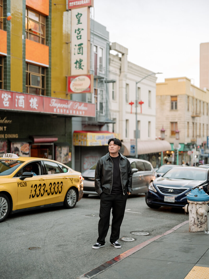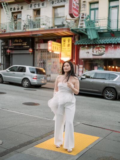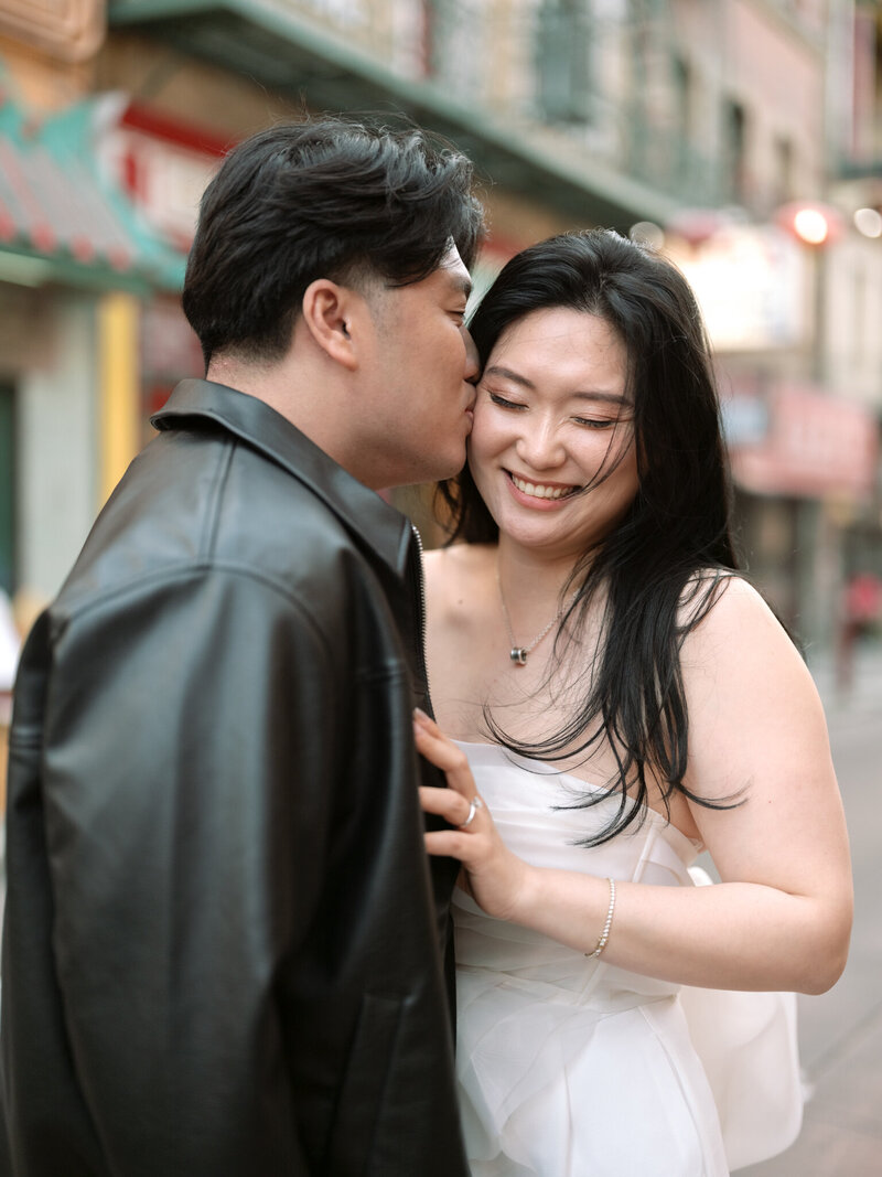 Chinatown's red lanterns and colorful storefronts proved to be the perfect backdrop for Kerry's vision of a downtown engagement session. The white MILLA ensemble Kerry chose was absolutely stunning; the flowing fabric against Sam's sleek black leather jacket created a beautiful contrast. Golden hour light transformed the bustling streets into the most romantic backdrop for celebrating their love.